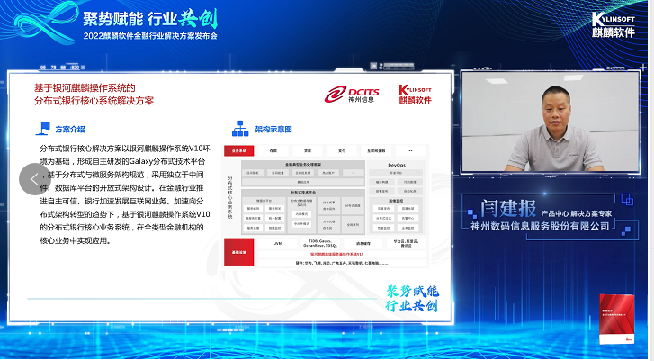其中,神州信息联合共创的“基于银河麒麟操作系统的分布式银行核心系统解决方案”等案例收录其中。神州信息解决方案专家闫建报在发布会上介绍了解决方案的技术路线、方案优势以及实际应用案例。此解决方案以银河麒麟高级服务器操作系统V10为基础,神州信息银行核心业务解决方案采用最新的“分布式+微服务+云原生”设计理念,在功能层面,面向服务流程化的设计理念,整体设计与开发遵循组件化、模块化、参数化的原则,在提供良好的复用扩展和改造特性同时,满足金融机构应对数字经济时代业务敏态创新、数据价值挖掘等需求,支撑业务的长效发展。在安全可控方面,全面实现与底层国产化软硬件的兼容,通过打造云及数字化安全底座,满足国内银行信息科技自主安全可控的要求。
