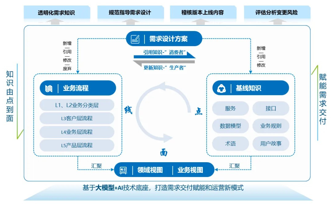 通过数智化需求知识图谱建设,将需求知识从点、线逐步汇聚成面:不断从需求过程中获取散落的业务流程、服务和数据模型等知识,形成业务流程和基线知识,并将基线知识进行串联,汇聚形成系统视图和业务视图。持续推动需求知识整合和数智化应用,将大模型技术应用到需求开发交付环节,深化“AI+需求交付”注智赋能,打造需求开发交付的“数字孪生”系统;